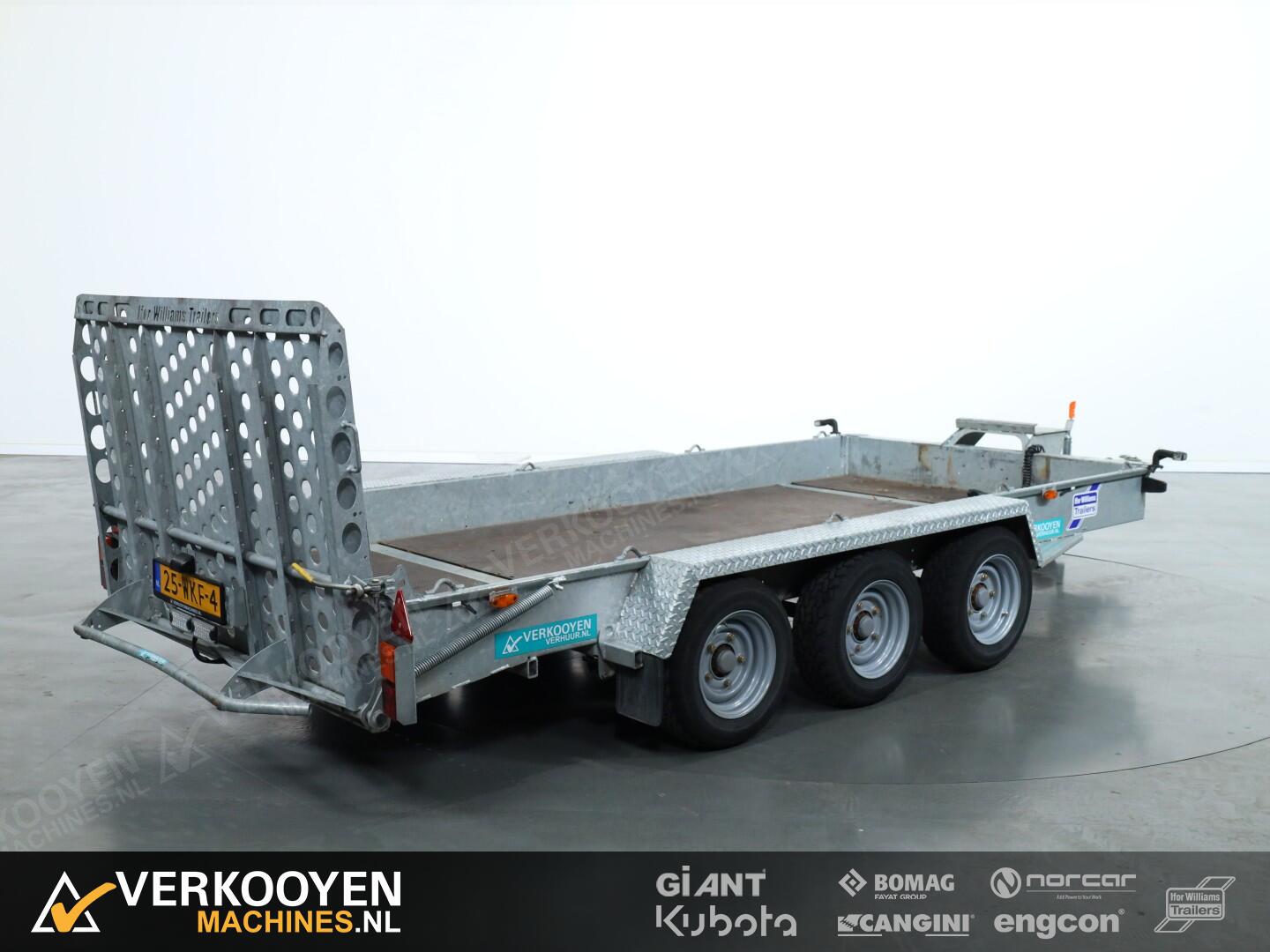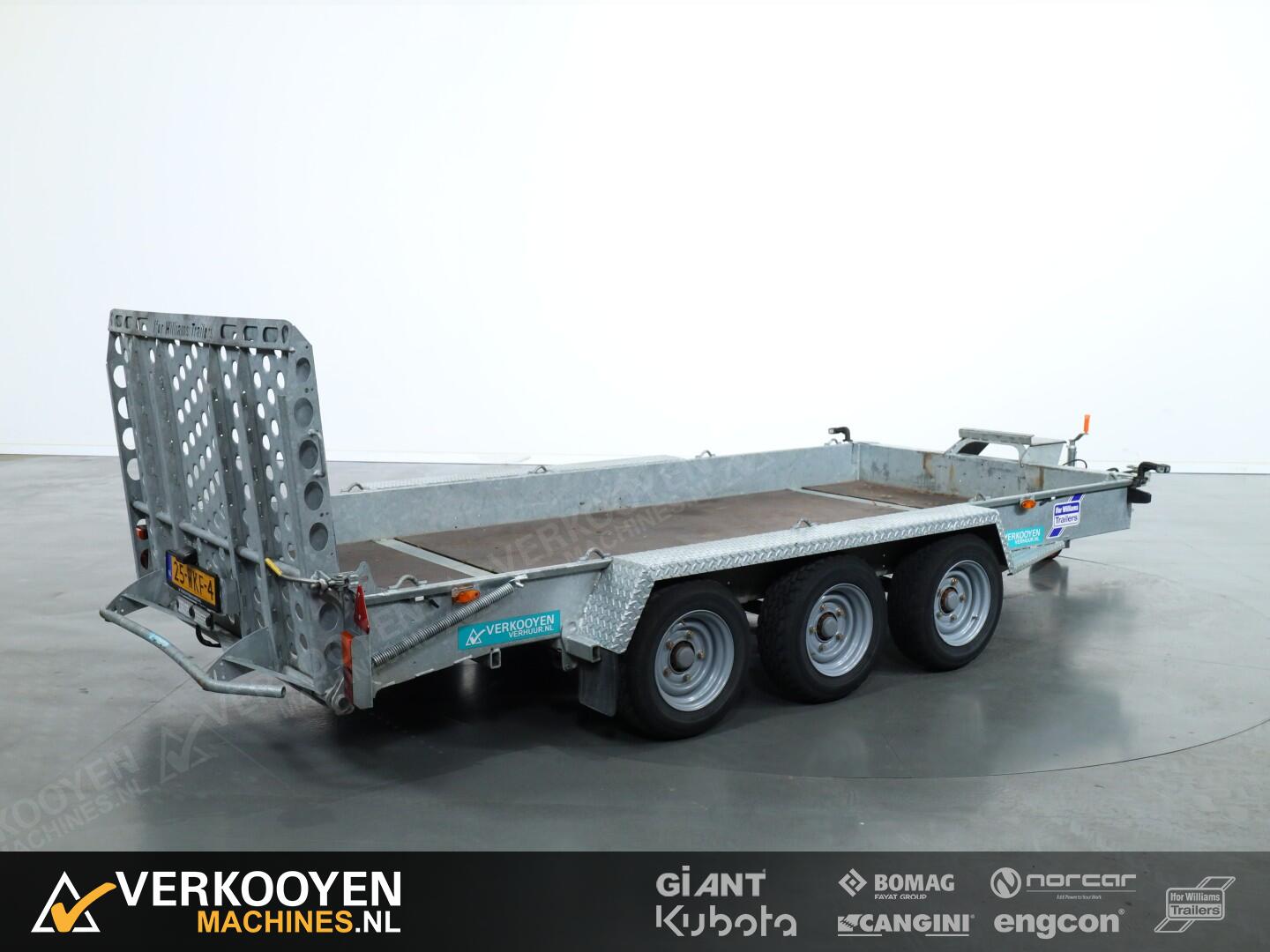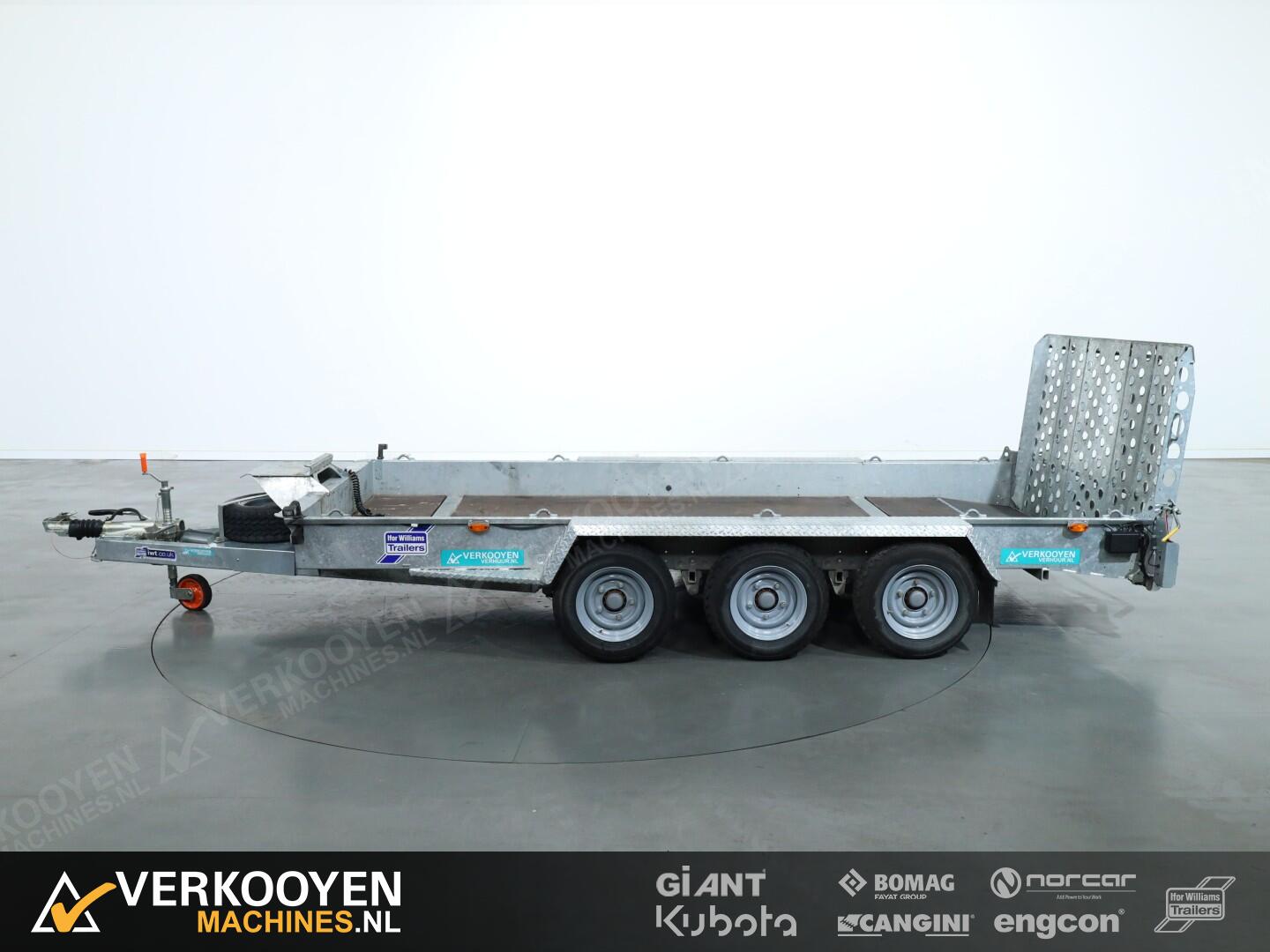 Ifor Williams GH146 machinetransporter. Deze Ifor Williams GH146 3-assige machinetransporter is uitgevoerd met bladgeveerde assen en heeft een maximaal draagvermogen van 3500 kg