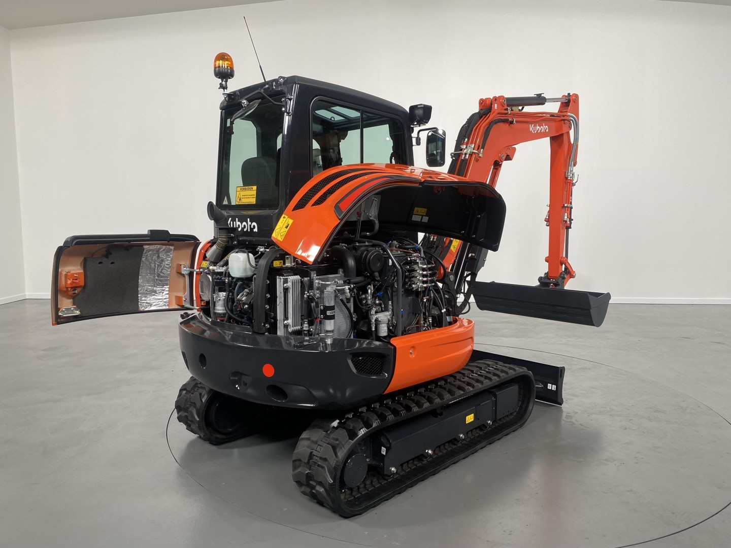 | Standaard uitvoering | Airconditioning Auto-Idling ECO PLUS Kubota Anti-Theft Slangbreuk hef Slangbreuk lepelsteel Twee extra hydraulische functies (proportioneel) Tweede rijsnelheid Werkverlichting Zweefstand dozerblad |